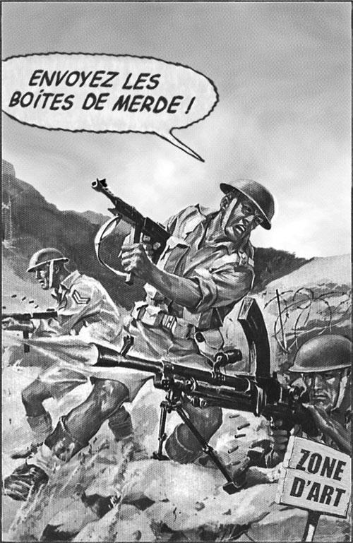 On est invité à voir de lui des pièces sur lesquelles il travaille de manière ponctuelle depuis plusieurs années. De grandes illustrations, piochées dans des bandes dessinées à deux sous, sont imprimées sur toile, en noir et blanc. Des phrases y sont ajoutées qui font référence au monde de l'art contemporain, des espèces de blagues de papillote pour public initié. Les images sont belles. Et la papillote, c'est lui. C'est peut-être ça, un artiste. Une papillote chauve.